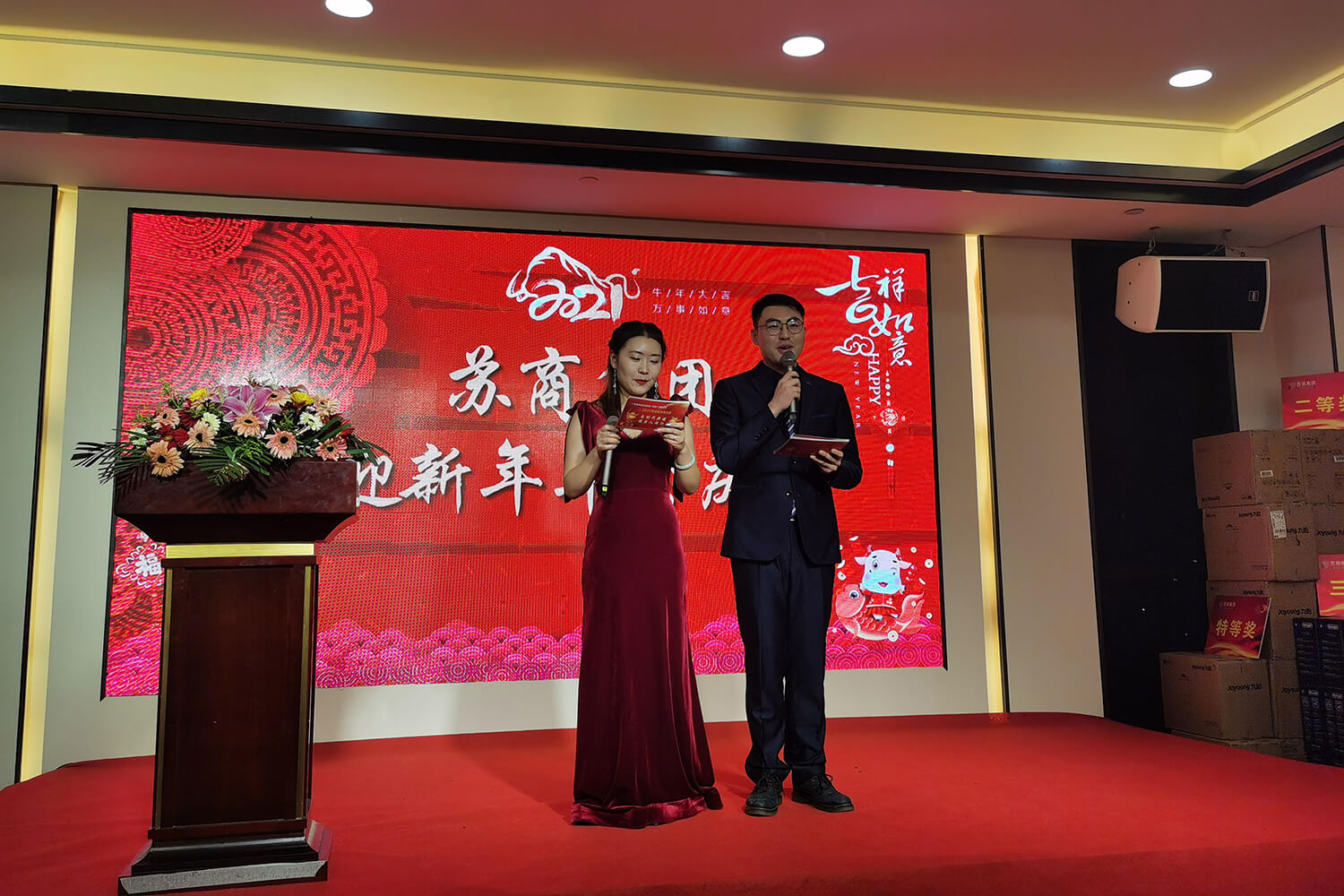 晚上18:30,蘇商集團(tuán)迎新年年會(huì)慶典在某酒店隆重舉行。